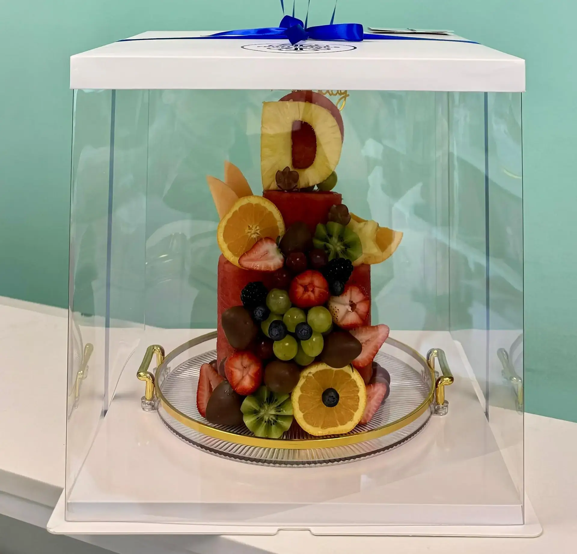 Wrapped with a clear acrylic dome cover, decorative ribbon, and bow, presented on a durable tray with golden handles.