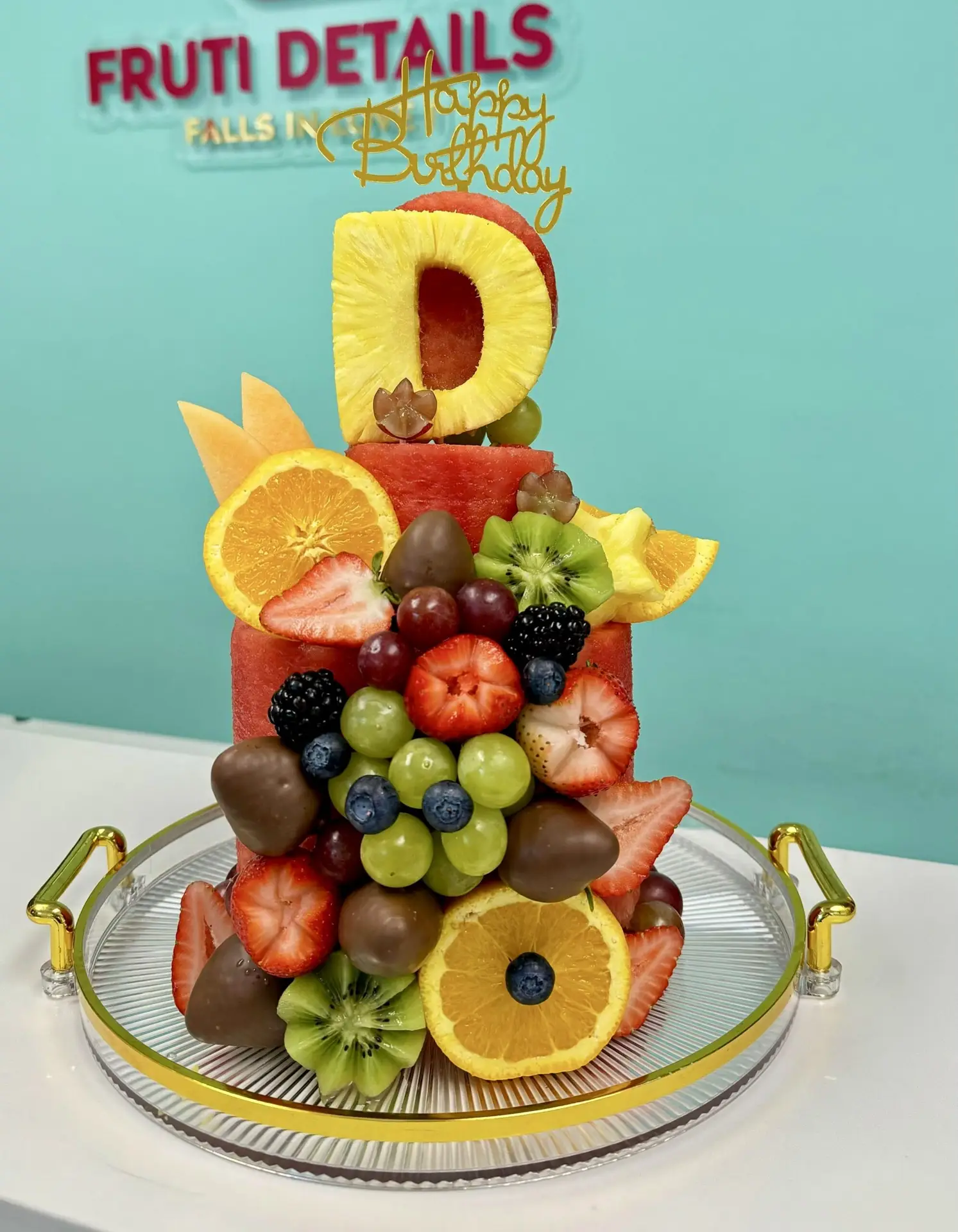 A golden acrylic “Happy Birthday” topper, turning this into a fruit cake centerpiece for birthday celebrations.