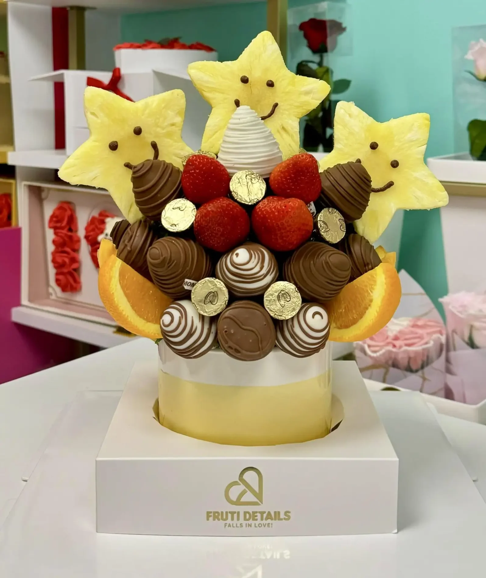 Make every birthday unforgettable with our luxurious Fruit Bouquet Birthday in Miami. Perfectly crafted for celebrations, this delightful arrangement combines stunning design with delicious flavors that are sure to impress. Our bouquet features chocolate-covered strawberries in vibrant pink, fresh cantaloupe slices, and marshmallows dipped in rosy chocolate. Each detail is carefully thought out to bring joy, style, and flavor to the occasion.