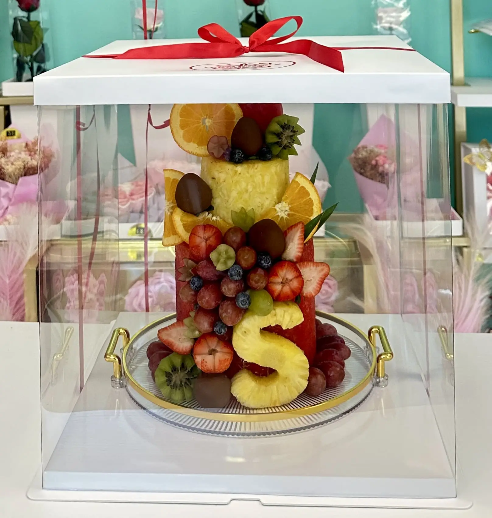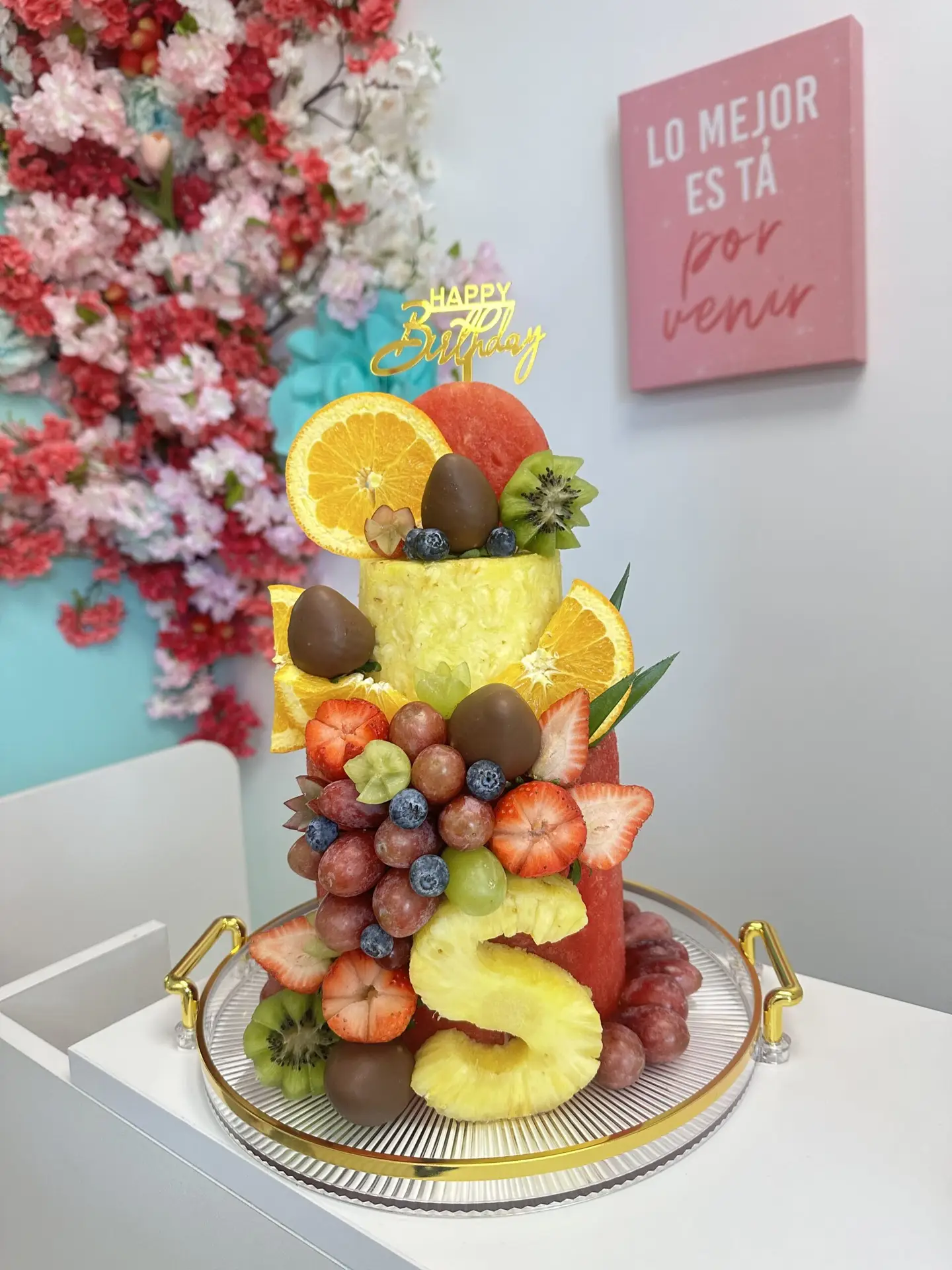 Fresh fruit as: Watermelon, Strawberries, kiwi, orange, blueberries, blackberries, chocolate covered strawberries.