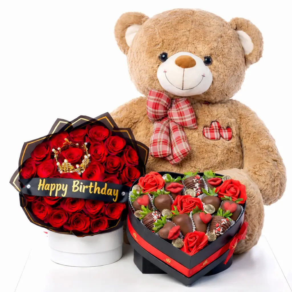 Happy birthday celebrations with Trios specials with Fresh Flowers, Teddy and Chocolate Box