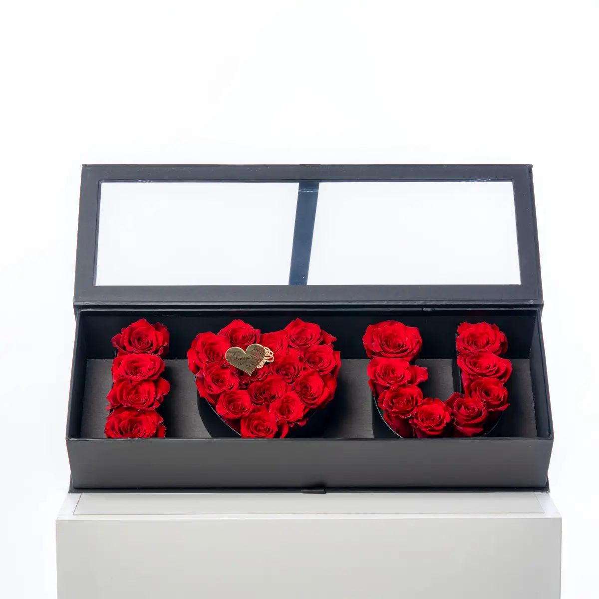 A luxurious 20-25-rose arrangement presented in an elegant box with a clear acetate window and finished with a gold heart topper that reads “Happy Valentine’s Day.” A timeless gift designed to impress.
