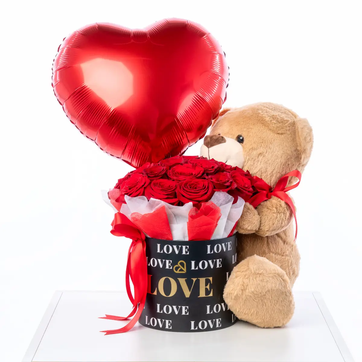 A beautiful and elegant rose box paired with a cute teddy bear and a balloon