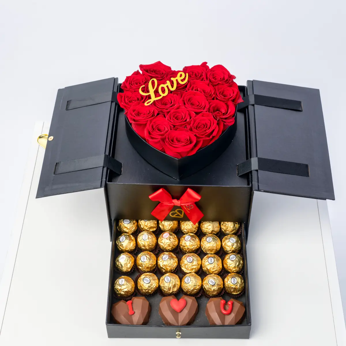 A stunning surprise box that opens to reveal a romantic combination of fresh roses and chocolate delights, featuring 3 Nutella-filled heart treats with the message “I ❤️ U”. The perfect Valentine’s Day gift to impress and make hearts melt.