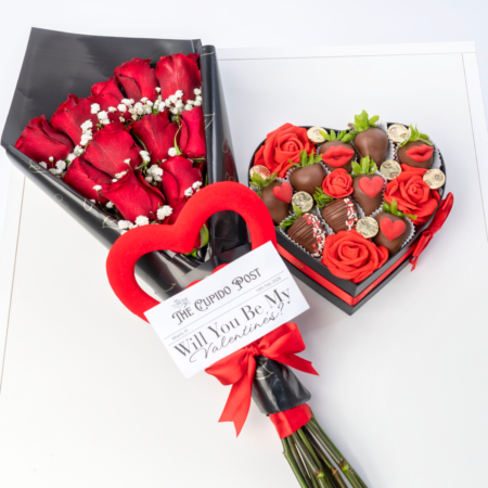 A beautiful Valentine’s set featuring a 12-rose bouquet and a heart box with 9 chocolate-covered strawberries.
